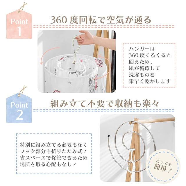 ✅ 大判のバスタオルやシーツもこれ一つで楽々干せる!くるくる洗濯ハンガー2個セットです。360度回転することで満遍なく風にあたることが可能で、洗濯物をムラなく乾かすことができます。室内で干すときも従来のような物干し竿のように場所を取る心配もなく省スペースで効率よく干していただくことが可能になりました!