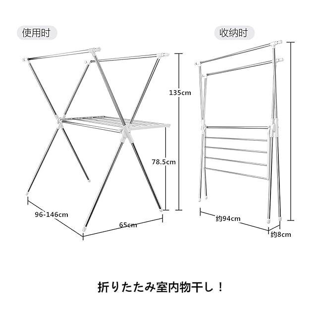 「X型デザイン、伸縮自由」新品登場!newデザインのX型物干しスタンド!X型は2本のバーを使えるので、洗濯物を容量たっぷり干すことができます。X型構造により荷重を分散し、安定性が良い!折りたたみやすいのでコンパクトに収納できる、一人暮らしや省スペースに最適のサイズです。竿の両端が伸びるので、多くの洗濯物が