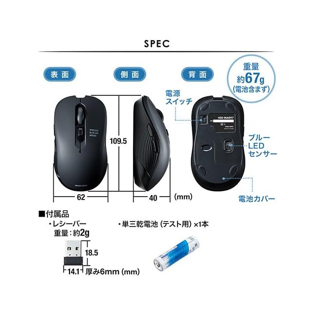 【仕様】製品サイズ:マウス/約W62×D109.5×H40mm、レシーバー/約W14.1×D18.5×H6mm 製品重量:マウス/約67g(電池含まず)、レシーバー/約2g 接続方式:2.4GHzワイヤレス RF電波方式(※マウスとレシーバー間のIDは固定です。) 通信範囲:木製机(非磁性体)/半径約10m スチール机(磁性体)/半径約2m コネクタ形状:USBコネクタ(Aタイプ)