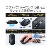 クリック音の静かな静音ボタンを採用し、周りに迷惑をかけずにマウス操作ができるワイヤレスマウスです。読み取り精度の高いブルーLEDセンサーで、光沢感のある面でもスムーズな操作が可能です。