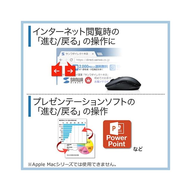 高感度のブルーLEDのワイヤレスマウスです。基本的な左右のボタンとホイールボタンに加えて、インターネットの閲覧やプレゼンテーションに便利な「戻る・進む」ボタンを搭載した5ボタンのマウスです。