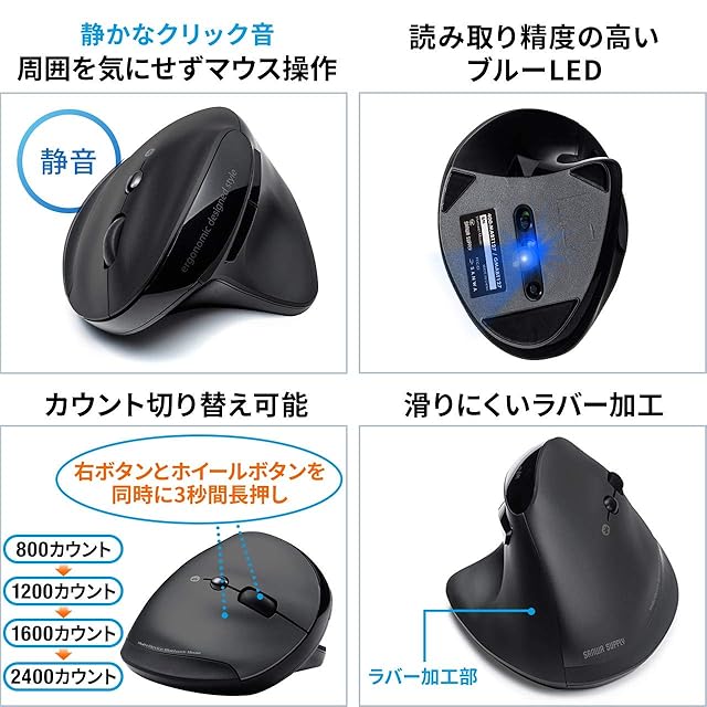 読み取り精度の高いブルーLEDを採用した エルゴマウス です。光沢のある机や布の上でもご使用いただけます。●用途に応じてカーソルスピードを800・1200・1600・2400カウントの4段階で調整できます。