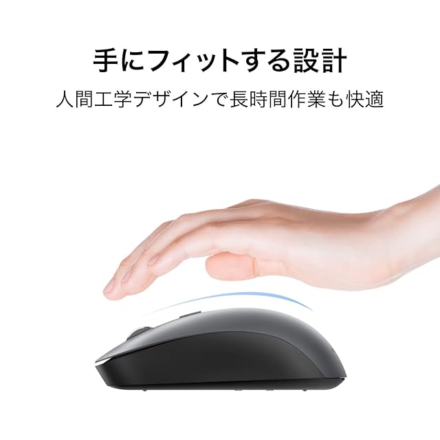 【手にフィットする設計】手のひらの曲線に合わせた人間工学設計で、長時間クリックしても快適な握り心地が持続します。