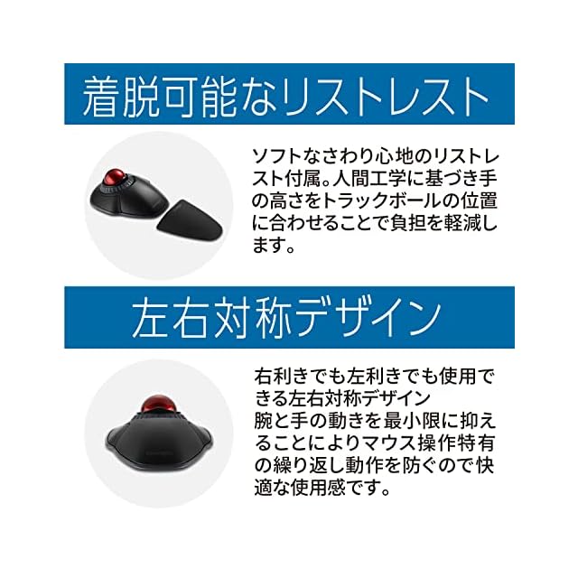 左右対称デザイン:右利きでも左利きでも使用できる左右対称デザイン 腕と手の動きを最小限に抑えることによりマウス操作特有の繰り返し動作を防ぐので快適な使用感です。