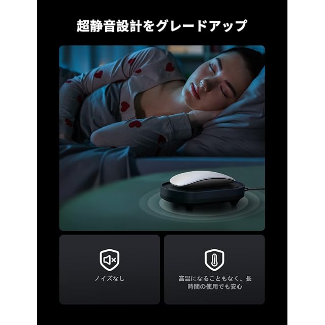 【超静音】他社製マウスジグラーの騒音問題を改善するため、小型超静音マイクロモーターを開発・応用しました。マウスムーバー作動時にはほとんど音がしないので、煩わしい騒音から解放されます。