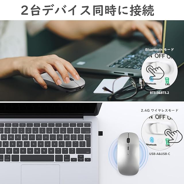 【成熟的な無線通信技術】2.4Gワイヤレスモード(USB-A&Type-C)とBluetooth モード(BT5.2&BT3.0)が搭載され、半径10mの広範囲で安定したデータ通信が可能です。違うデバイスと同時に二つのモードでペアリング後、ワンタッチだけでワイヤレスマウスで2つのデバイス間の自由な切り替えを実現しています。(ご注意:2in1レシーバーは、マウスの背面の収納口に入ってあります。)