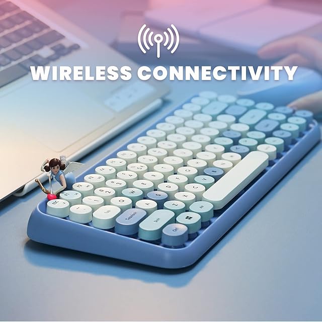 【おしゃれなレトロデザイン】タイプライターをイメージしたレトロデザインのコンパクトなキーボード・マウスセット。かわいいパステルブルーをベースにグラデーションカラーが特徴です。