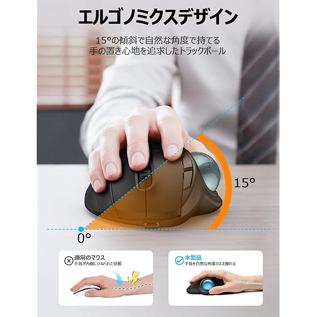 【さらに進化を遂げた人気トラックボールマウスが新登場】JUNNUP(ジュンヌプ)から全面アップデートとなるトラックボールマウスのNEWモデルが登場!マウス長時間使っていると手首や肩などが痛くなる悩みを抱えていますか?ぜひ手首や肩が疲れにくく、場所を取らないトラックボールマウスがお試しください!ボールを手で転がすことでカーソル操作ができるJUNNUP製トラックボールは、手になじみやすいエルゴノミック形状を採用しています。15°の傾斜と手にフィットする形状で、手首や腕の負担を最小限に抑えながら使用できます。設置にスペースを必要とせず、デスク周りをスッキリさせることも可能。小さなコーヒーテーブルでも、狭い作業スペースでも、マウスのようにスライド操作不要のトラックボールであるから、快適かつ精確な作業が可能。オフィスでの利用はもちろん、在宅勤務にも最適なワイヤレスマウスです。