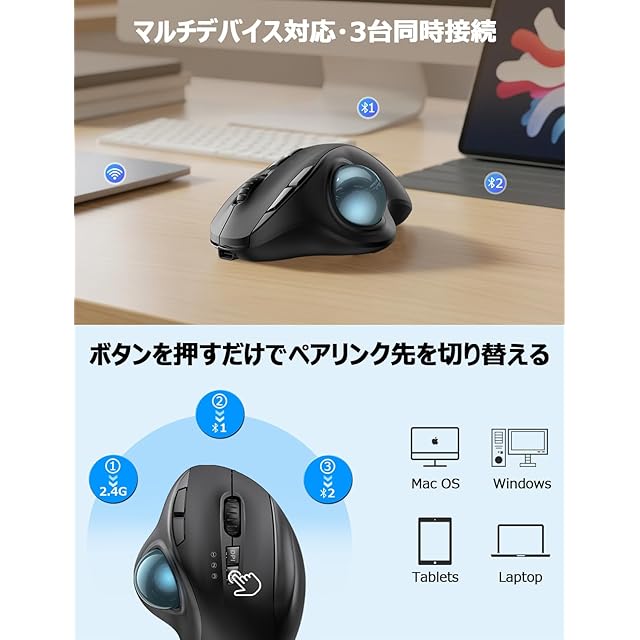 トラックボール JUNNUP Bluetooth &2.4GHz USBレシーバー 2モード 【NEWモデル】 3台同時接続 マウス トラックボール 親指 右利き 節電モデル Type-C充電式 ワイヤレス マウス ボール 7ボタン 静音タイプ 5DPIモード 戻る/進むボタン搭載 無線 長時間待機 Windows/Mac/Androidなど対応 レシーバー付属 オフィス/在宅勤務に適用