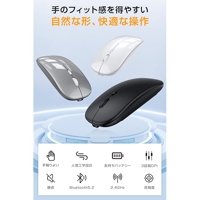 ✅【マルチ接続・Bluetooth5.2 & 2.4GHz対応】最新のBluetooth5.2と2.4GHz USBレシーバーを搭載し、ノートパソコン・タブレット・デスクトップPC・iPadなど様々なデバイスに対応可能な マウス 。ボタン一つでデバイス間を瞬時に切り替えられるため、テレワークやマルチタスク作業にも最適な 無線マウス 。業界最先端チップを採用し、常に安定した接続でスムーズな操作を実現します。