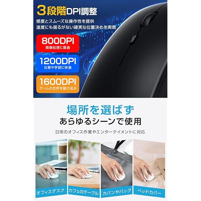 ✅【DPI3段階調整・精密なカーソル操作】800 / 1200 / 1600 DPIの3段階調整機能を搭載し、作業に応じた最適な速度で操作が可能な マウス 。精密なデザイン作業から、素早いスクロールが求められる業務まで、用途に合わせて快適なカーソル操作ができます。
