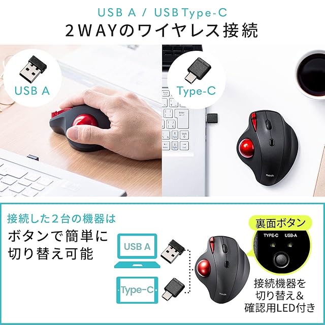 USB -Aレシーバーと Type-C レシーバーの2種類の接続方法に対応しています。接続した2台の機器はボタンで簡単に切り替えが可能です。付属のケーブルで繰り返し 充電 して使える充電式の ボールマウス です。。