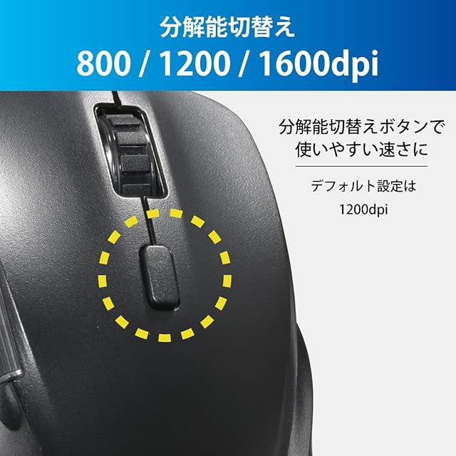 ◆静音設計 クリックのカチカチ音を抑えた設計で、音が気になる場所での使用にも便利です。 ◆Bllue LEDセンサー 従来の赤色LEDと比べて波長が短く読み取り性能が高いため、わずかな凹凸やほこりを読み取り、快適な操作が可能です。 ◆7ボタン+2ホイール搭載 ◆作業場面に合わせてマウスカーソルの速度を800/1200/1600dpiの3段階に切替できます。 ◆Mサイズ ◆本体カラーはブラックです