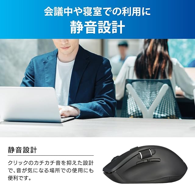 【 特 長 】 ◆3台のデバイスを操作可能 無線2.4GHz(1台)とBluetooth5.2(2台対応)を搭載し、パソコンやタブレットなど3台のデバイスをこれ1台で操作できます。 使用環境に合わせた接続方法をボタン1つで簡単に接続可能です。※同時接続はできません。 ◆サイド横スクロールを搭載 独立のサイド横スクロールを搭載しています。ExcelやWord、Web使用時の作業効率が大幅に向上します。※Office2016以降のみに対応します。 ◆省電力Bluetooth5.2対応 Bluetooth verは省電力性を重視して開発された新規格Bluetooth ver5.2に対応しています。