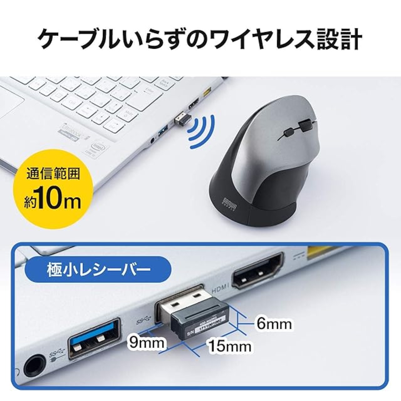 ケーブルを気にせず使用できる 無線 接続です。 USB -Aレシーバーを接続するだけで使用可能です。