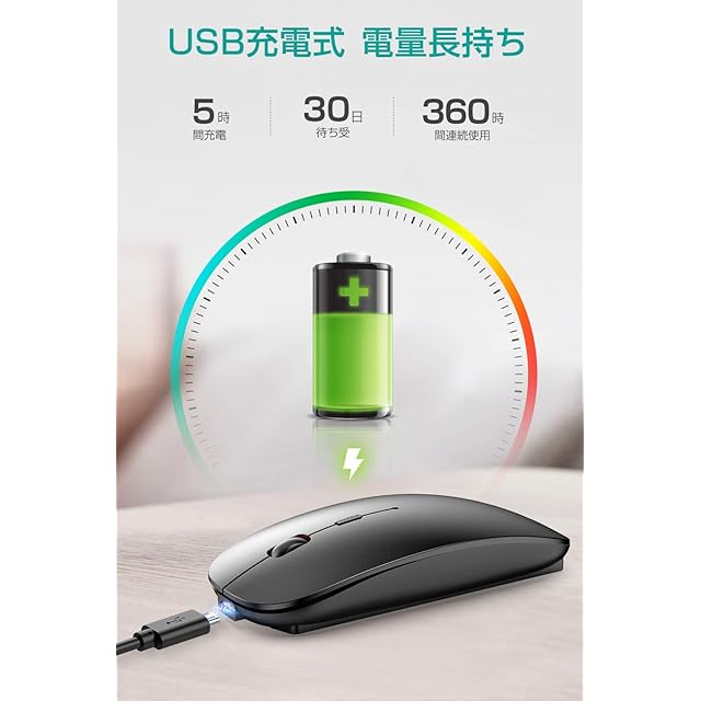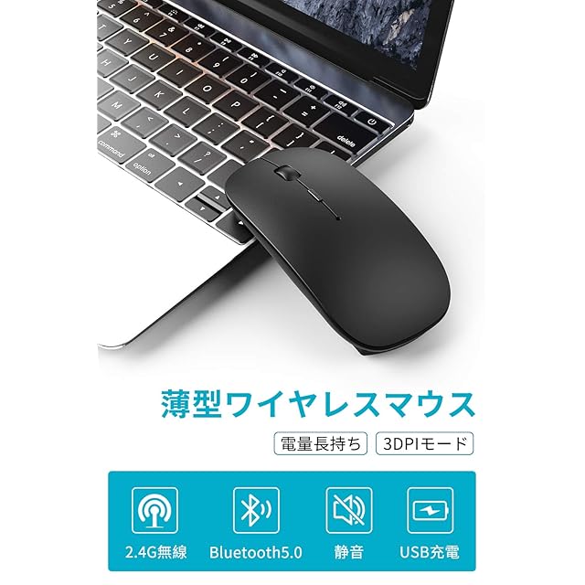 ワイヤレスマウス Bluetooth 5.0 マウス 超薄型 静音 充電式 省エネルギー 2.4GHz 3DPIモード高精度 持ち運び便利 iPhone/iPad/Mac/Windows/Surface/Microsoft Proに対応 (ブラック) (黒)