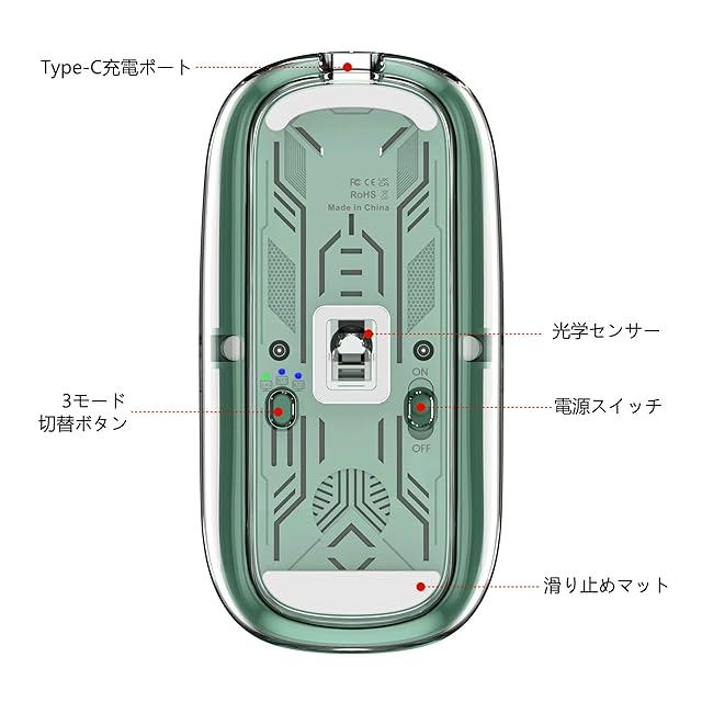 透明マウス 2.4G USB ワイヤレス Bluetooth 静音 Type-C充電 4DPI 3台接続 軽量 光学式 PC ノードパソコン スマホ タブレット用 iOS Android Macbook Windows Microsoft対応(グリーン) | ascend