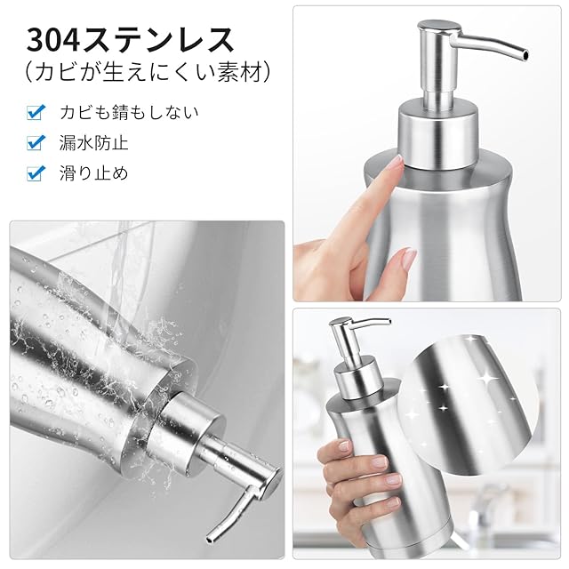 【304ステンレス・ABS】食器用洗剤 ボトルの外層には304ステンレス、内層にはABSを使用しています。ソープディスペンサーのボディーはステンレスの糸引き技術を採用しており、キラキラとした外観を持っています。ABSは酸性やアルカリ性の液体でも使用できます。、湿気の多い環境でも錆びにくく、特殊な塗装により腐食防止効果を高めています