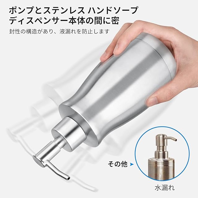 【手動ポンプ式・液漏れない】:ポンプボトルは手動式ですが、粘度の高い洗剤を使う場合でも、オートディスペンサーと比べて詰まることがなく、簡単に押し出すことができます。ポンプとステンレス 食器洗剤 ボトル本体の間に密封性の構造があり、液漏れを防止します。また、金属製の304ステンレスと耐久性のあるプラスチックでできているため、ディスペンサー自体の損傷による水漏れを防止します