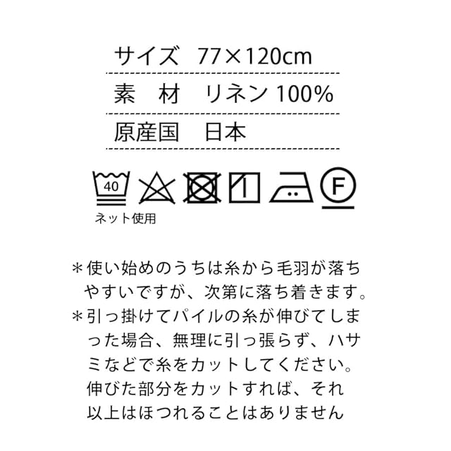 【サイズ】77x120cm【素材】リネン100%【原産国】日本【お手入れ方法】手洗いか、もしくはネットに入れて洗濯機の弱水流でお洗濯できます。脱水は短めにしてください。【その他】使い始めのうちは糸から毛羽が落ちやすいですが、次第に落ち着きます。引っ掛けてパイルの糸が伸びてしまった場合、無理に引っ張らず、ハサミなどで糸をカットしてください。