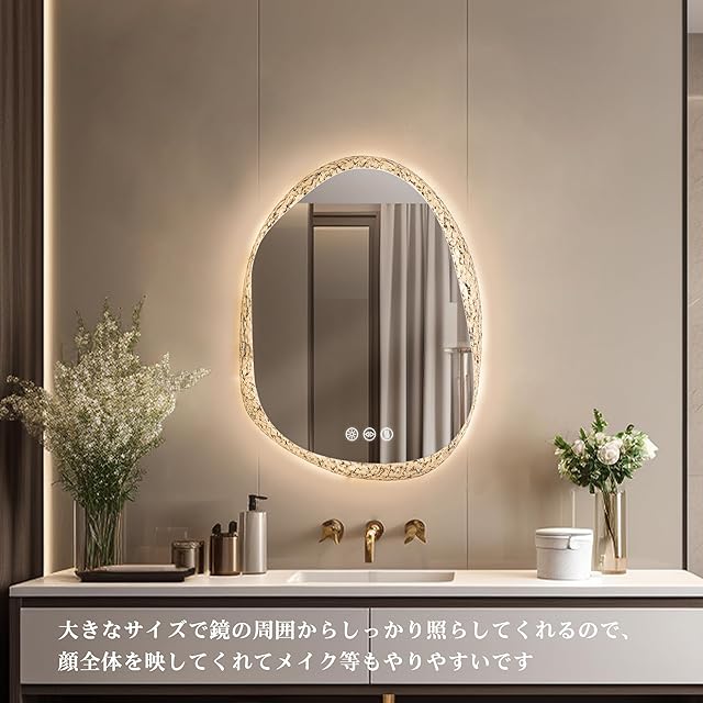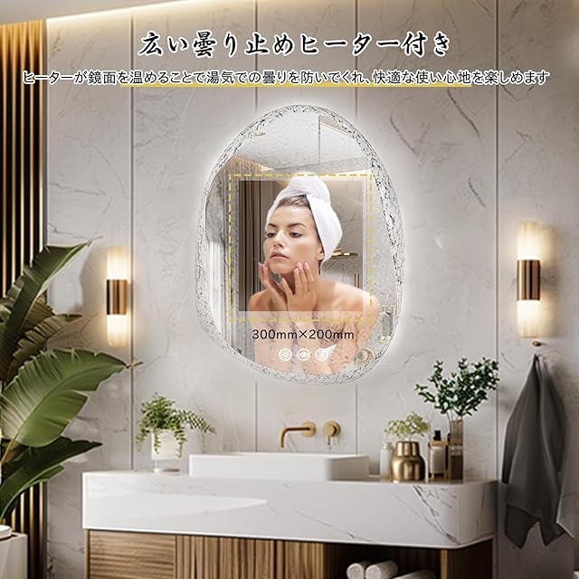 【冬場でも便利に使える曇らない鏡】ヒーター付きの洗面鏡で、鏡面にある防曇ボタンをタップし、鏡を温めることで蒸気による鏡の曇りを防いだり解消したりできるため、冬に使用するのにとても便利です