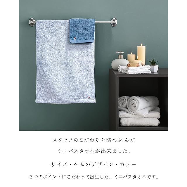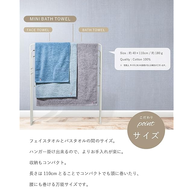【中厚で部屋干しにおすすめ】厚みを持たせすぎない設計で乾きやすい。ミニバスタオルなので収納時も場所をとりません。
