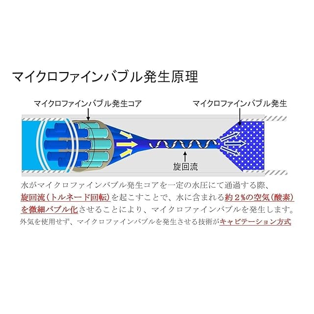 水中に含まれる空気のみでマイクロファインバブルを発生させる「キャビテーション方式」で約20~30%の節水効果になります