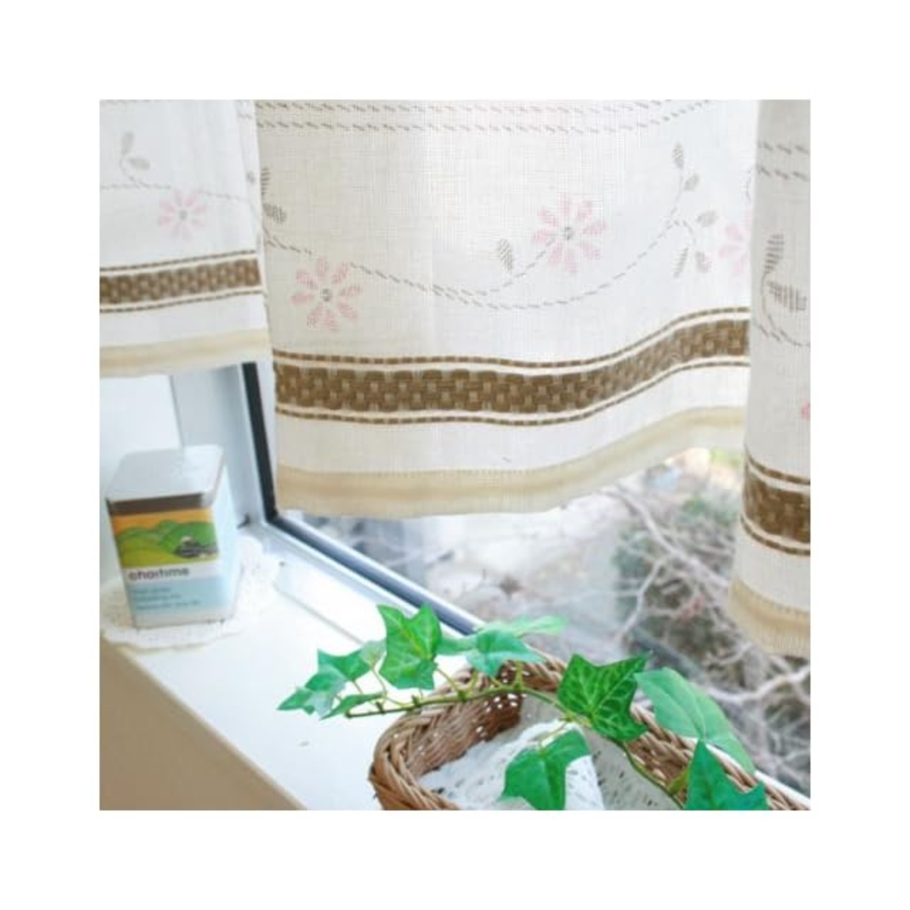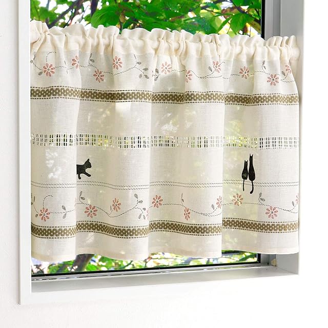 柔らかくほんのり透け感のあるナチュラル素材。まるでステッチされているかのようなネコのプリントがキュートなカフェカーテン。