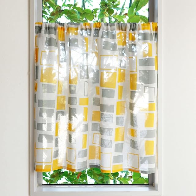 【デザイン】イエロー×グレー×ホワイトの北欧テイストカフェカーテン。シンプルな四角のモチーフと大胆な配色が可愛いデザイン。子供部屋、棚やカラーボックスなどの目隠しにもおすすめ。