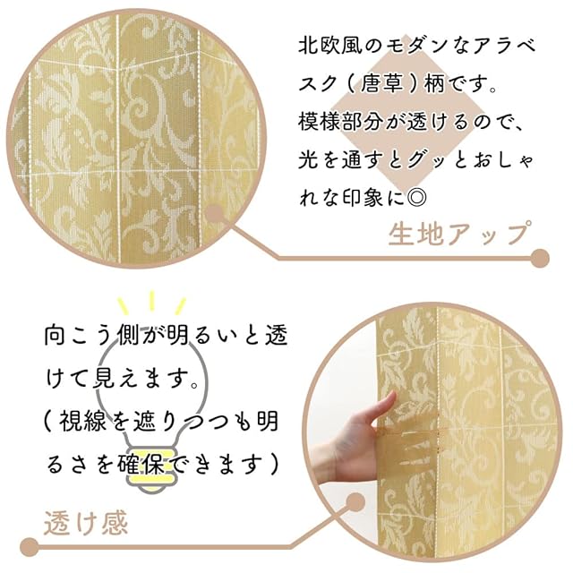 【ポイント】おしゃれな北欧風唐草アラベスク柄で模様部分が透けています。ほどよい透け感がおしゃれな商品です。リビング、キッチン、ドア、階段、玄関、等の間仕切り、目隠しとしてお部屋のすきま風を防止し冷暖房効率をアップさせるecoな商品です。使用しないときは10㎝程度にたたんでおけますので通り抜けの邪魔になりません。