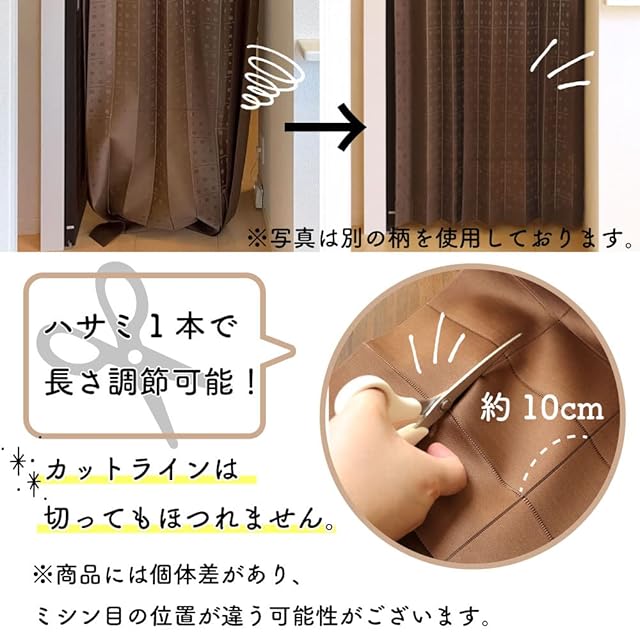 【仕様】直径約3cmのポール(棒)をギリギリ通すことができますが、直径約2.2cmくらいまでのポールの使用がおすすめです。(※つっぱり棒をご使用の場合は、両端のキャップの太さも考慮してください。キャップが取り外せるものもございます) 透け感:向こう側の明るい部分がうっすらと透けて見えます。(光っている電気や、明るい窓の形以外はほとんどわかりません。濃色の部分はやや透けやすいです。) サイズ調整が可能。縦横(約)10cm間隔に入っているカットラインに沿ってハサミで切ることができます。竿通し部分まで切らないようにご注意ください。