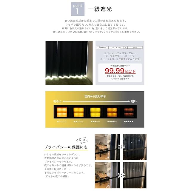 ◆1級遮光(99.99%)&形状記憶付きカーテン ◆幅100cmx丈110cm 2枚組 *全色同じ生地を使用しておりますが、1級遮光の中でも濃色ほど遮光率は高まります。