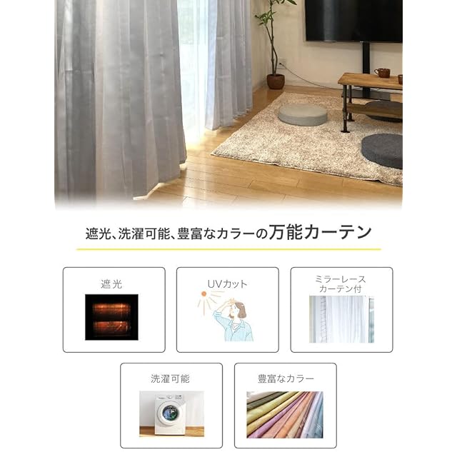 【生地材質】ポリエステル100%。(遮光カーテン)遮光ランク★☆☆☆☆[遮光率98.87%:遮光等級外級]*写真4枚目をご確認下さい。*薄めの軽量タイプ生地。*弱遮光性です。