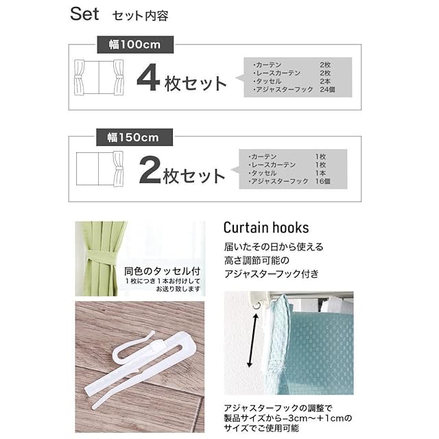 【付属品】高さ調節可能なアジャスターフック付き(製品1枚に付き5個)。遮光カーテン用タッセル2本付き。
