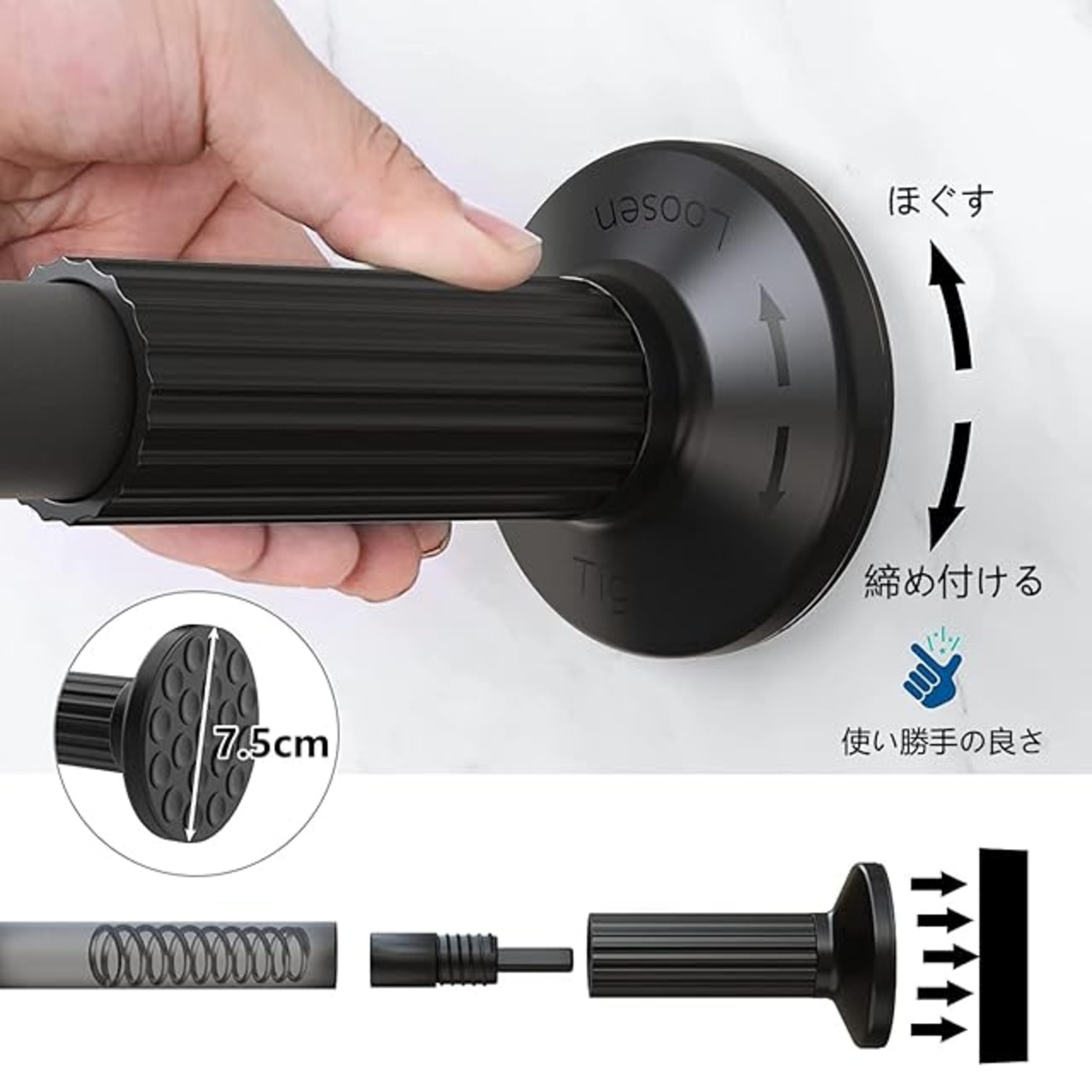 【高品質素材】①パイプ材質:つっぱり棒は炭素鋼製で 錆びが出ることなく、カビにも強く、湿気の多い浴室に設置すれば、梅雨季節でも乾燥機や換気扇で乾燥させることができます。(※つっぱり棒の表面を防さび処理と塗装でしっかりガード)② 両端の圧着板:ABS樹脂 壁と直接に接触する部分は合成ゴム です。接着面が滑り止めゴムとハニカム構造を採用して、摩擦力が增えて、どんな壁にも強力で圧着し、ズレ落ちを予防できます。