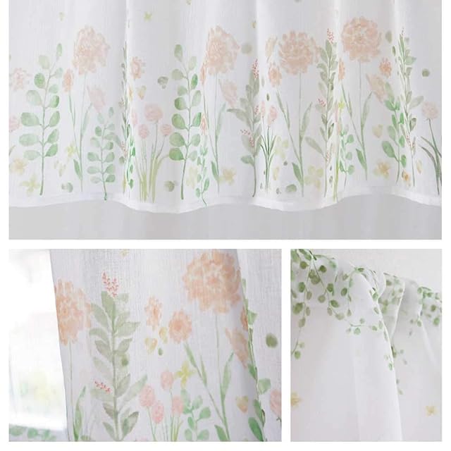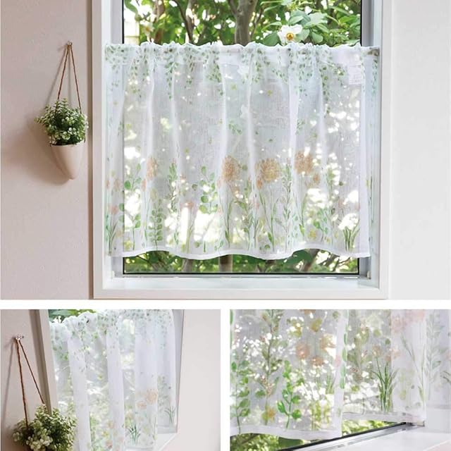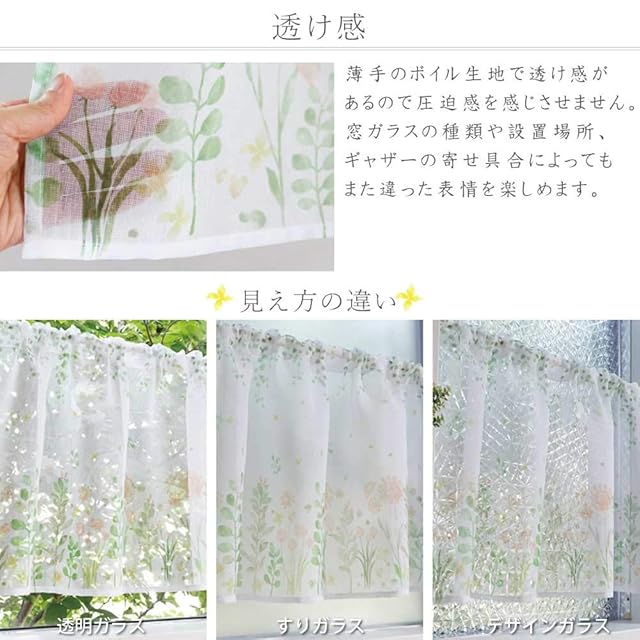 【窓辺を華やかに彩るボイルカフェカーテン】ふわっと軽く、シャリ感のある薄手ボイル生地に可愛い草花をプリントしました。透け感があり、そよ風に揺れる様はとても華やかです。棚の目隠しにもおススメ。