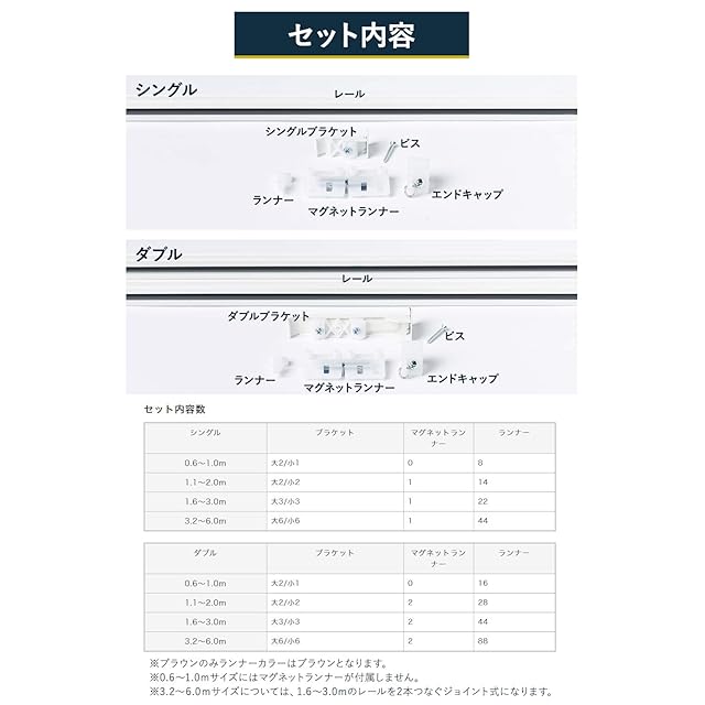 【付属品】レール本体,取付ブラケット,取付用ビス(3×25mm),ランナー,正面付け用ブラケット ※0.6-1.0mサイズにはマグネットランナーが付属しません 【摘要】日本製