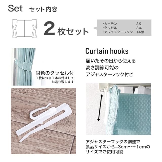 【付属品】高さ調節可能なアジャスターフック付き。 共生地カーテン用タッセル付き。