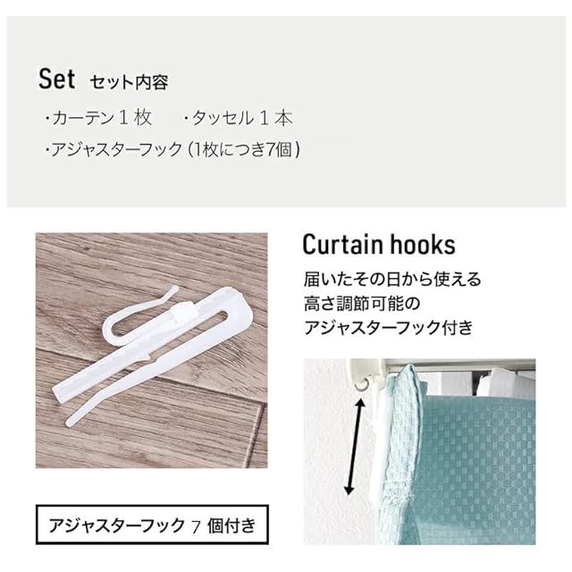 【付属品】高さ調節可能なアジャスターフック付き。 共生地カーテン用タッセル付き。