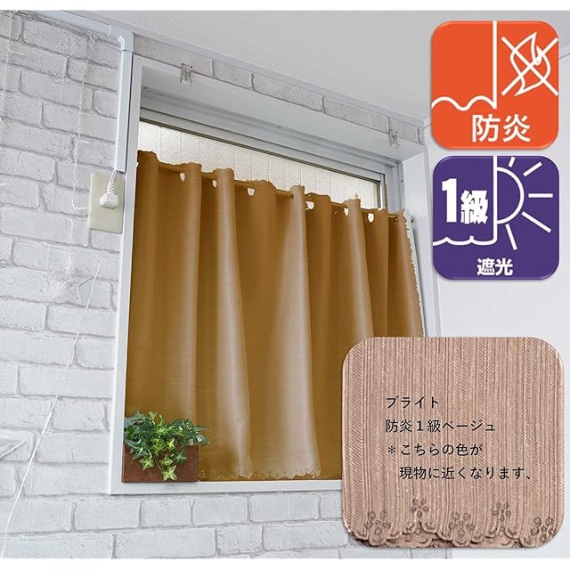 【製品・カラー・サイズ】 カフェカーテン・ ベージュ [ブライト・防炎・遮光1級] ・ 幅95cm x 丈70cm [1枚入] 適応窓サイズ:幅40 - 80cm
