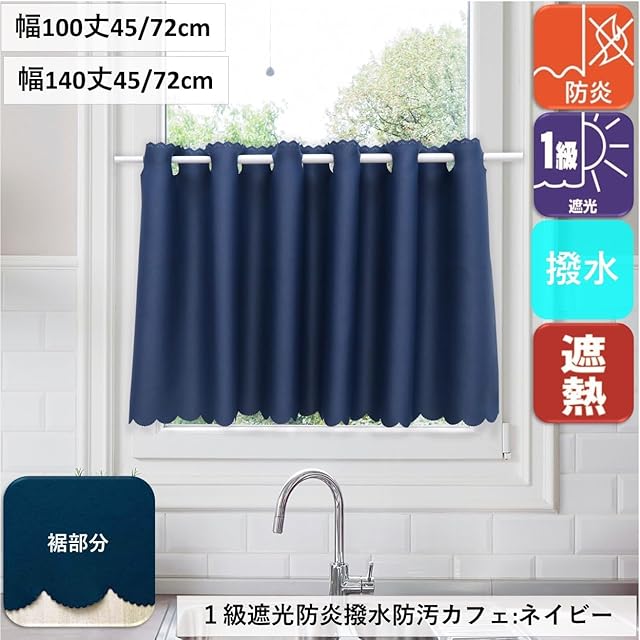 【製品・カラー・サイズ】 カフェカーテン・ネイビー [防炎・遮光1級・撥水・防汚] ・ 幅100cm x 丈70cm [1枚入] 適応窓サイズ:幅40 - 80cm