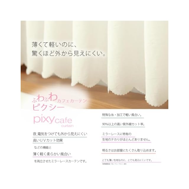 とっても薄い生地なのに、不思議なくらい外から見えにくいです。※お部屋の中からも外が見えにくくなりますので、ご注意下さい。帝人「ウェーブロン」を使用。さらに特殊な糸・加工で柔らかい風合い。特殊な加工で糸のボリュームをアップさせて、ミラーレース特有のテカテカ感を抑えています。