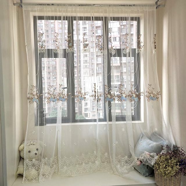 カントリーカーテン 女の子部屋のために薄手の刺繍された花のレースのカーテン トランスペアレント 結婚式の部屋のためのボイルチュールカーテン ガラス引き戸 バルコニーリビングルームのウィンドウトリートメントドレープ2枚組青幅150*丈178cm
