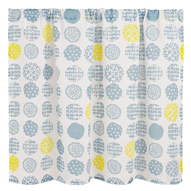 【デザイン】くすみブルー×イエロー×ホワイトの北欧テイストカフェカーテン。温かみのある手書き風タッチのモチーフと派手すぎない色合いが素敵。子供部屋、棚やカラーボックスなどの目隠しにもおすすめ。
