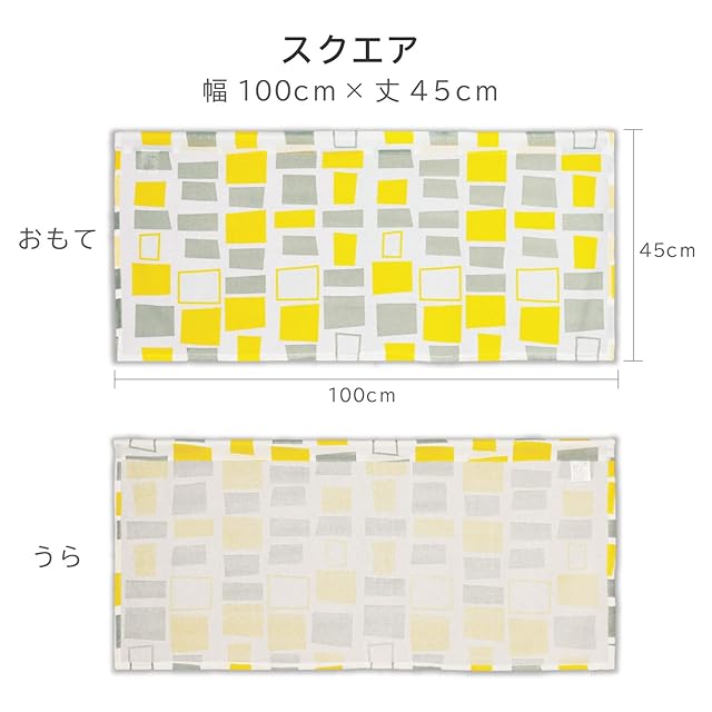 【デザイン】イエロー×グレー×ホワイトの北欧テイストカフェカーテン。シンプルな四角のモチーフと大胆な配色が可愛いデザイン。子供部屋、棚やカラーボックスなどの目隠しにもおすすめ。
