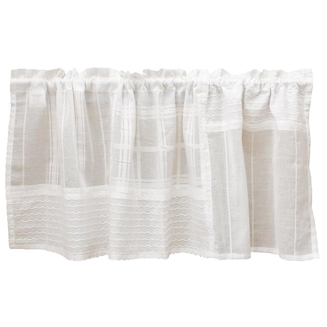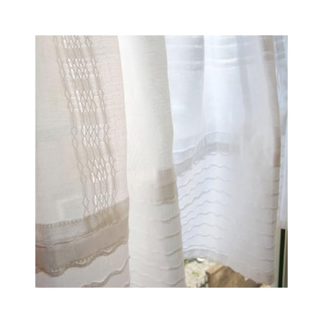 【デザイン】パッチワークで仕上げたコットン100%のナチュラルなカフェカーテン。表情の違う生地を縫い合わせているのにホワイトだからシンプルで使いやすいデザイン。プリントでは表現できない生地感が楽しめます。
