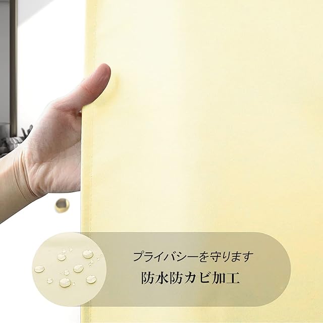 【防水防カビ加工、清潔感あり】防水防カビ処置済みの100%ポリエステル製により、衛生的で清潔感に保つ、ポリエステル素材の特性のため、ビニールのようなにおいがしない、やわらかくて肌触りよい、赤ちゃんにも安心使用でき、バスタイムが快適になるバスカーテンです。