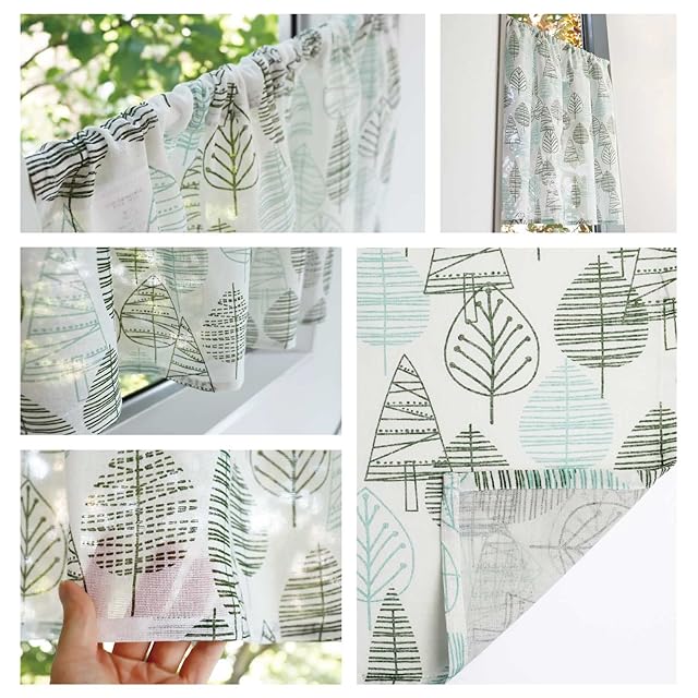 【デザイン】グリーン×ホワイトの北欧テイストカフェカーテン。シンプルな線で描かれた木のモチーフと優しい色使いはどこかほっこりと安らぎを感じます。子供部屋、棚やカラーボックスなどの目隠しにもおすすめ。