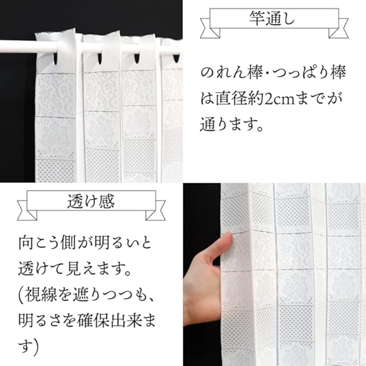 【仕様】竿通し:直径約2cmのポール(棒)をギリギリ通すことができますが、直径約1.5cmくらいまでのポールの使用がおすすめです。 ※つっぱり棒をご使用の場合は、両端のキャップの太さも考慮してください。キャップが取り外せるものもございます。 透け感:向こう側が明るいと透けて見えます。(視線をさえぎりつつも、明るさを確保できます) サイズ調整が可能。縦横に入っているカットラインに沿ってハサミで切ることができます。竿通し部分まで切らないようにご注意ください。