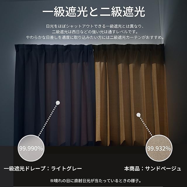 【二級遮光】遮光性が高くなる密度まで詰めて織り上げることで99.932%の遮光カーテンに。二級遮光なので強い日差しを遮り、程よく光を室内に取り入れ快適に。